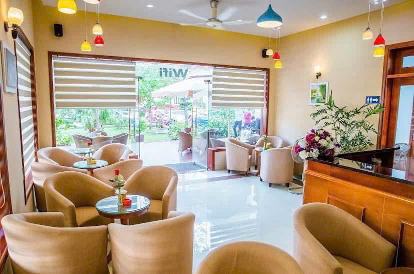 Quầy bar - cafe sang trọng giữa không gian xanh mát. Tọa lạc giữa khuôn viên xanh được thiết kế sang trọng tinh tế, là nơi lý tưởng để thư giãn và tận hưởng những khoảng khắc bình yên, bao quanh bởi những vườn hoa rực rỡ và cây xanh tươi mát, tại đây quý khách có thể thưởng thức các loại cafe rang xay nguyên chất hay đồ uống trái cây tươi mát trong khi phóng tầm mắt ra khung cảnh thanh bình của nhà nghỉ dưỡng. Dù là buổi sáng thư thả hay chiều hoàng hôn lãng mạn, quầy bar - cafe luôn sẵn sàng phục vụ với phong cách chuyên nghiệp và thân thiện.